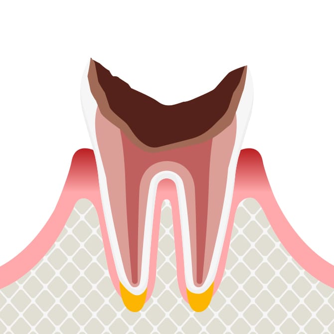 むし歯が歯の内部に広がり、エナメル質の奥の象牙質まで進んだ状態です。